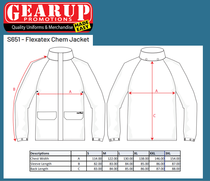 Flexatex™ Chem Jacket is fully waterproof, with an antifungal treatment and is resistant to 10% sodium hydroxide. It is fully certified to EN 13034 chemical standard. The material is extremely durable and has exceptional tear and tensile strength.