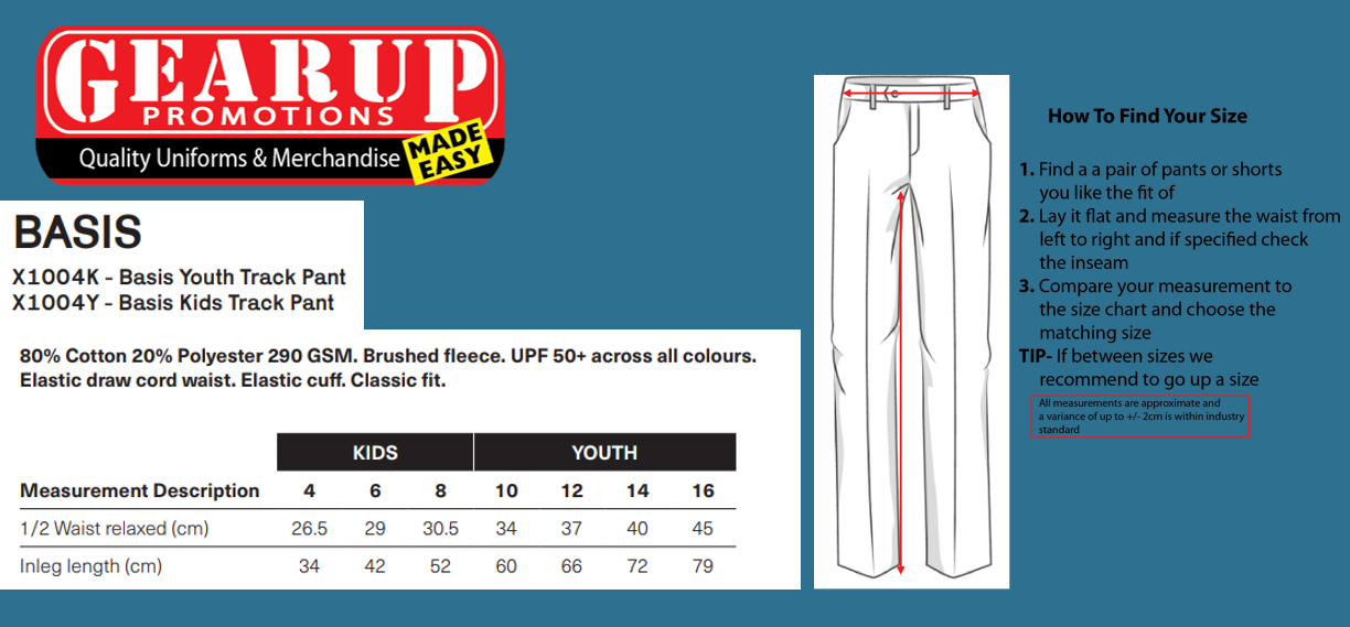 Features: These soft brushed fleece Basis trackies are made with a comfy elastic waist, easy fit, and solid construction that stands up to the rough and tumble. It's basics, built better. Great for growing bodies that don’t sit still for long. Washable, wearable, dependable. Elastic draw cord waist. Elastic cuff. Fabric: 80% Cotton 20% Polyester Brushed Fleece 290gsm Cold machine wash. Wash with like colours.Do not bleach. Do not tumble dry. Line dry in shade. Low iron on reverse. Do not dry clean. Sizes: 4, 6, 8