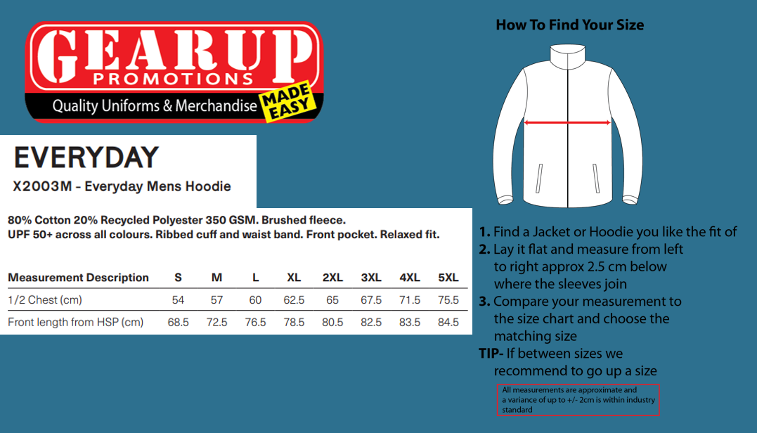 Features: Cosy up without slouching out. With a relaxed silhouette and a super-soft 350gsm brushed fleece feel, the Everyday Hoodie brings warmth and shape together in the best way. Ribbed finishes and a classic front pocket keep it casual and clean. A no-fuss favourite you’ll reach for again and again. Ribbed cuff and waist band. Front pocket. Fabric: 80% Cotton 20% Recycled Polyester Brushed Fleece 350gsm Cold machine wash. Wash with like colours.Do not bleach. Do not tumble dry. Line dry in shade. Low iron on reverse. Do not dry clean. Sizes: S - 5XL