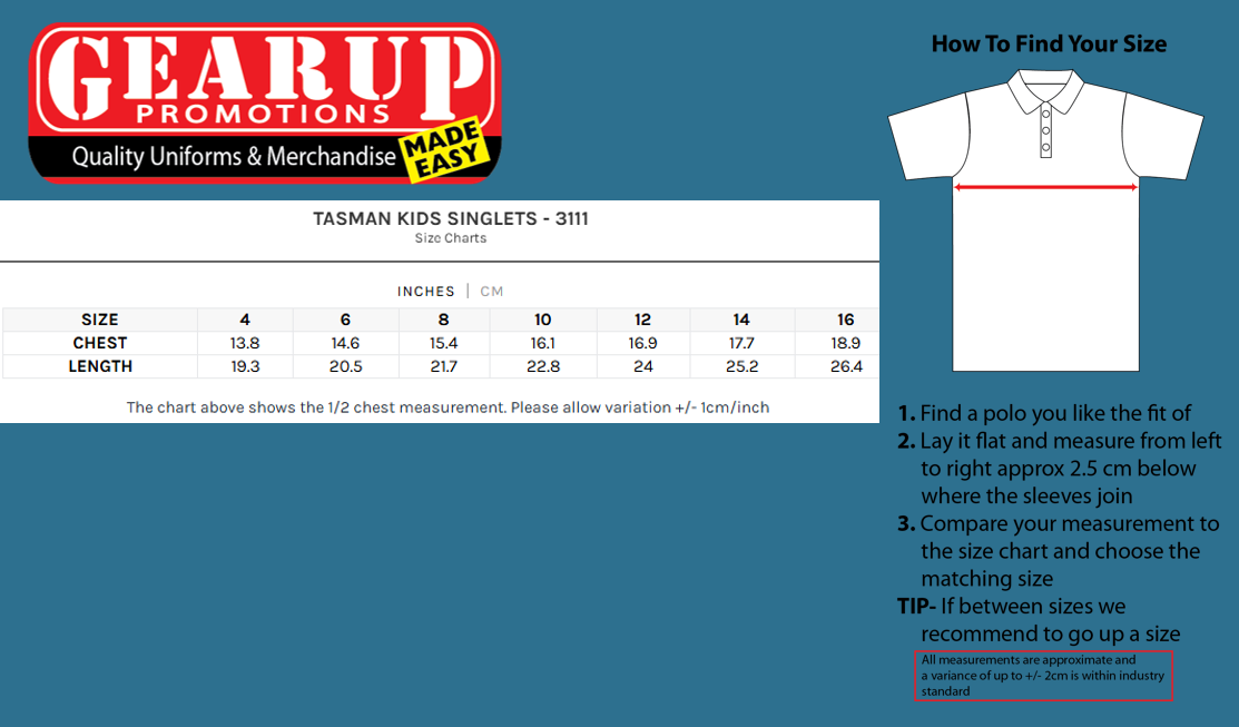 STYLE: 3111 Sizes: 4 - 16 Product Description: Your team needs a new uniform? We have you covered with our Tasman singlet. Available in 32 colours with matching designs in polo shirts, tees, track suits and sports bags, you don’t need to look any further. When you need lightweight and 100% performance, the Tasman is your best choice Fabric: 150gm 100% Polyester Features: Moisture removal micro-knit Dri-wear antibacterial finish Snag resistant Easy care fabric Round self fabric neck bind (men's and kids only) Contrast side panels Back neck reflective tab for earphones