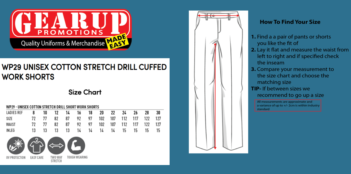 Unisex Cotton Stretch Drill Short Work Shorts FABRIC 265gsm - 97% Cotton, 3% Spandex Drill. STYLE Cotton drill fabric with added stretch Full elasticated waist with drawstring for comfort/ adjust fit Heavy duty fabric for all conditions All pockets with nylon patches for durability. Sturdy reinforced belt loops and key loop Deep side slant pockets and large back patch